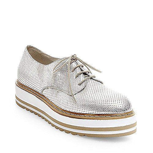 Featuring flashy metallic uppers and striped platform soles, VASSAR is a show stopping shoe. Allover perforations make the oxford perfect for warm weather. Silver: man-made upper material Black: leather upper material Textile lining Rubber sole 1.5 inch platform